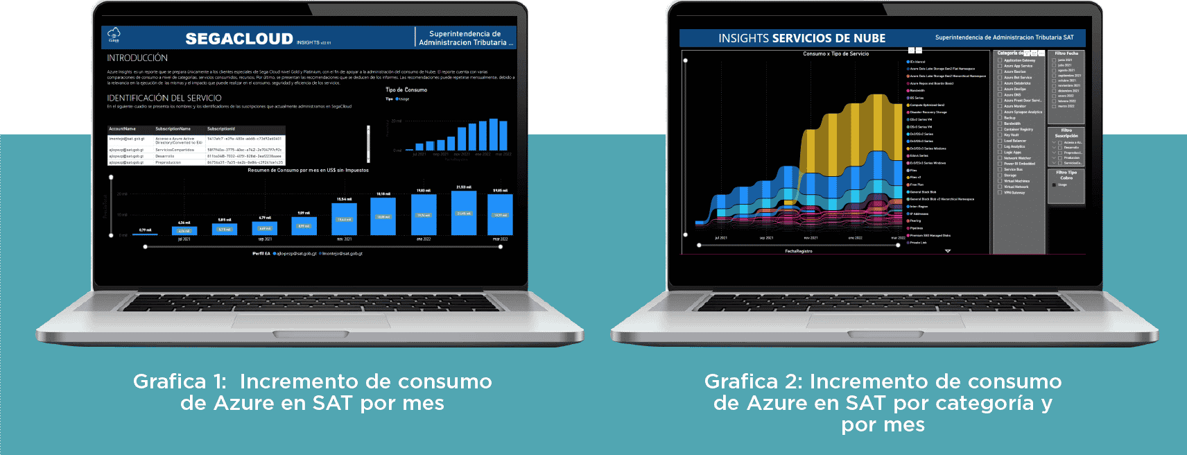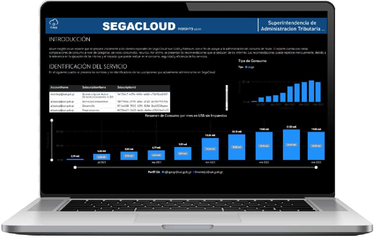 le da acceso a la SAT de paneles de datos para el análisis y control de consumos personalizados según sus necesidades. Estos paneles nos permiten dar seguimiento a la optimización de costos de SAT, identificando potenciales ahorros que existieran dentro de la infraestructura, generando lealtad del cliente hacia la nube de Azure como hacia Sega.
